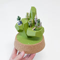 同品項作品組成以及配色會是相同的,像是左圖的露營地景都有深綠色的山脈以及台地、紅色的露營車、橘色的帳篷以及營火、深色步道,還有三棵松樹。不過元素的相對位置會有微調,像是點點苔蘚的位置也都不同。