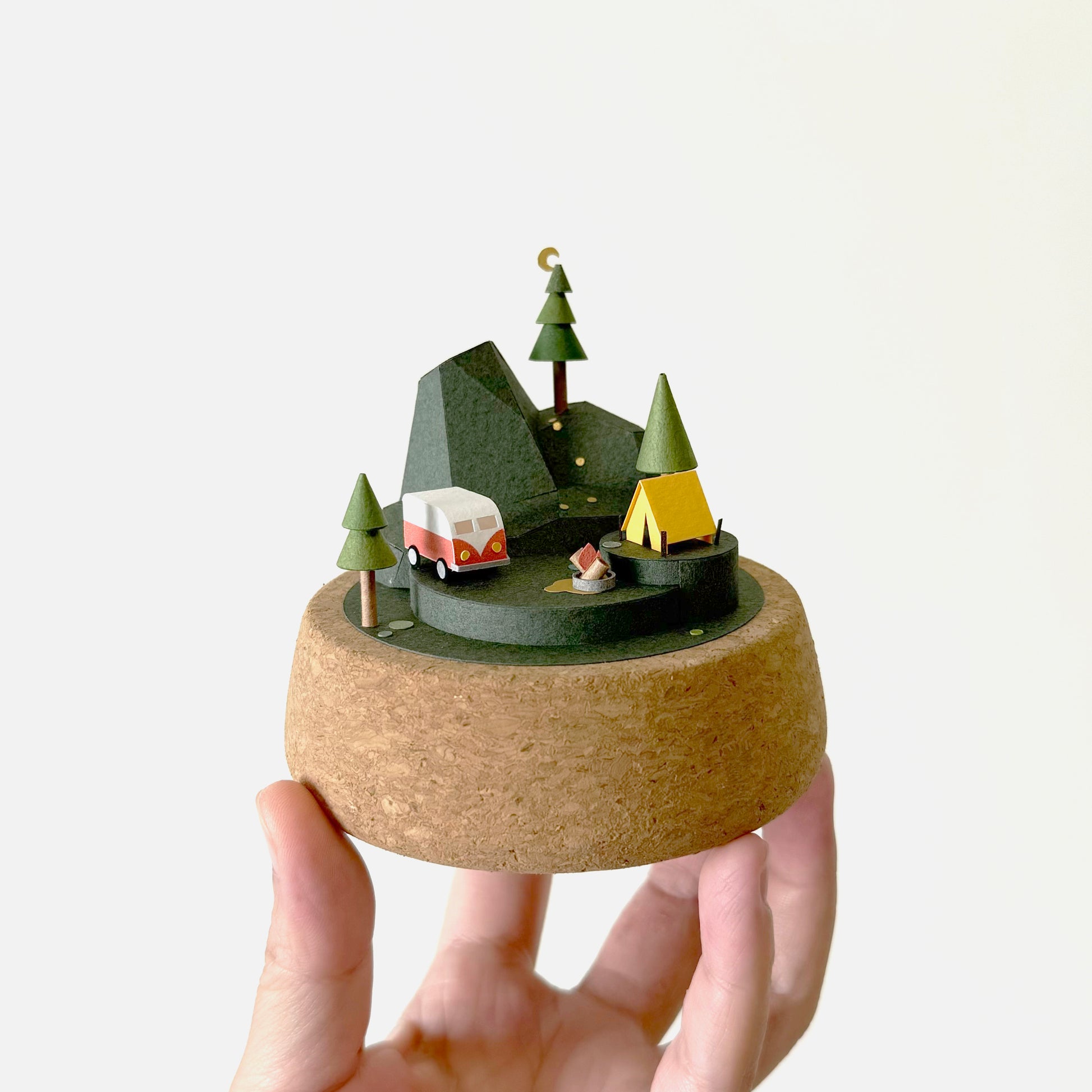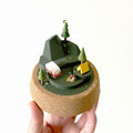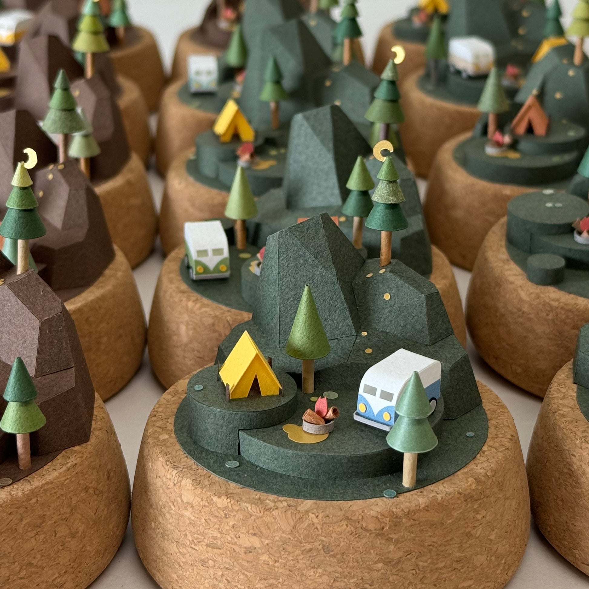 同品項作品組成以及配色會是相同的,像是左圖的露營地景都有深綠色的山脈以及台地、紅色的露營車、橘色的帳篷以及營火、深色步道,還有三棵松樹。不過元素的相對位置會有微調,像是點點苔蘚的位置也都不同。