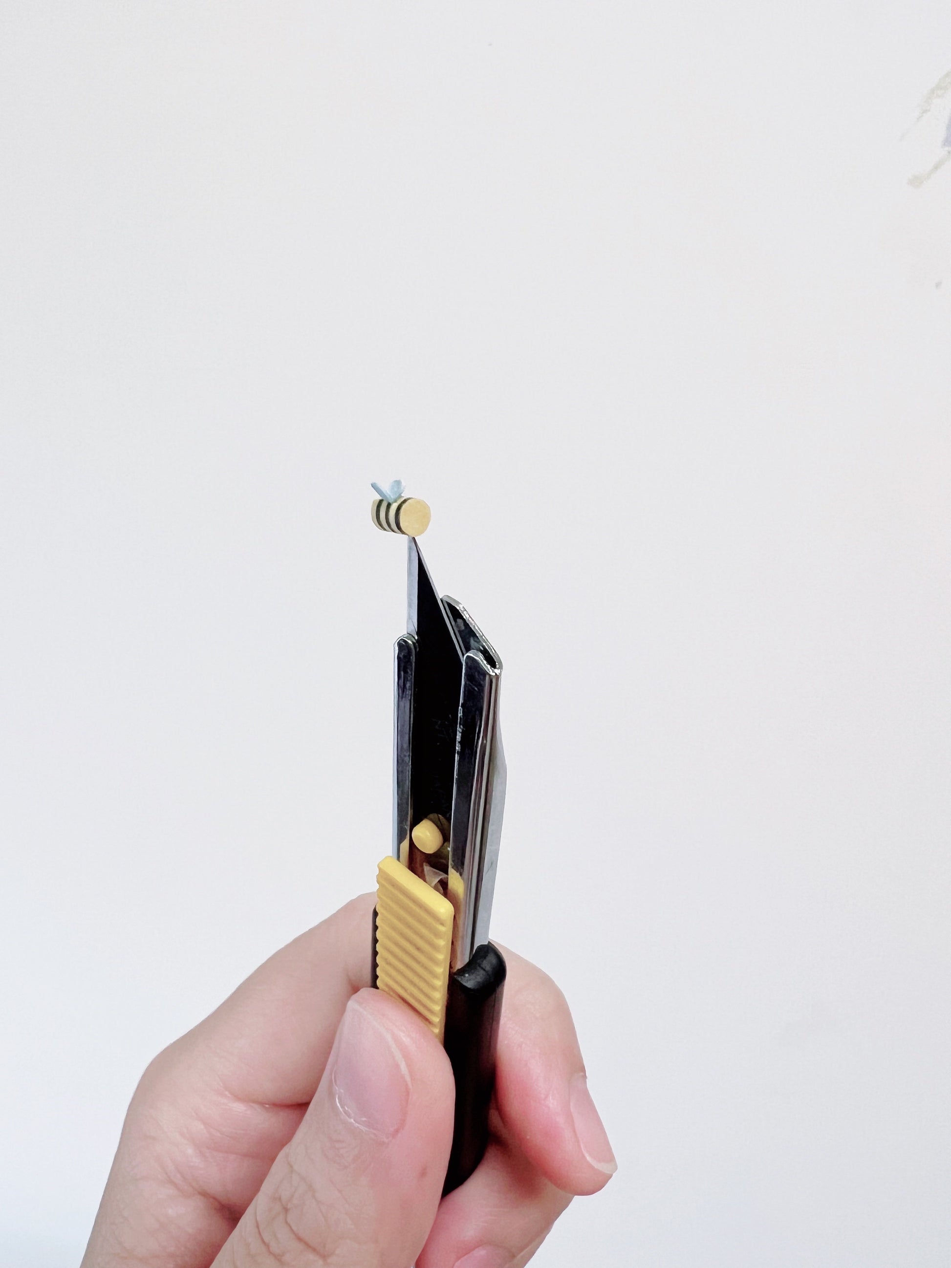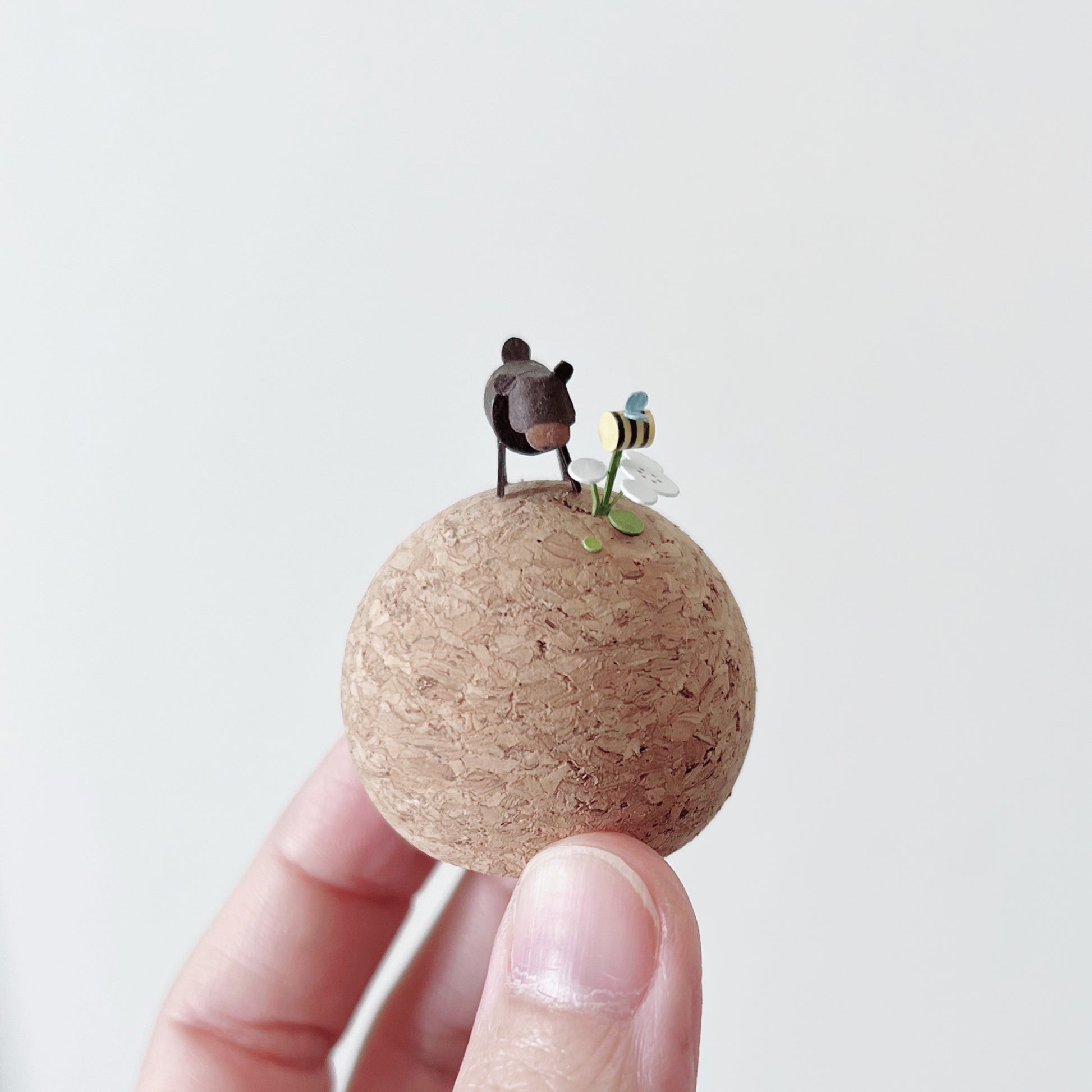 我好喜歡微小但巨型的花叢,花朵上蜜蜂是紙間設計的得意之作!粘上翅膀的那個瞬間, 臉上的微笑都收不住。熊的鼻子輕輕地塗上紅銅色,站在嗡嗡的蜜蜂旁靜靜待著。