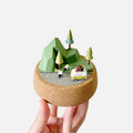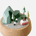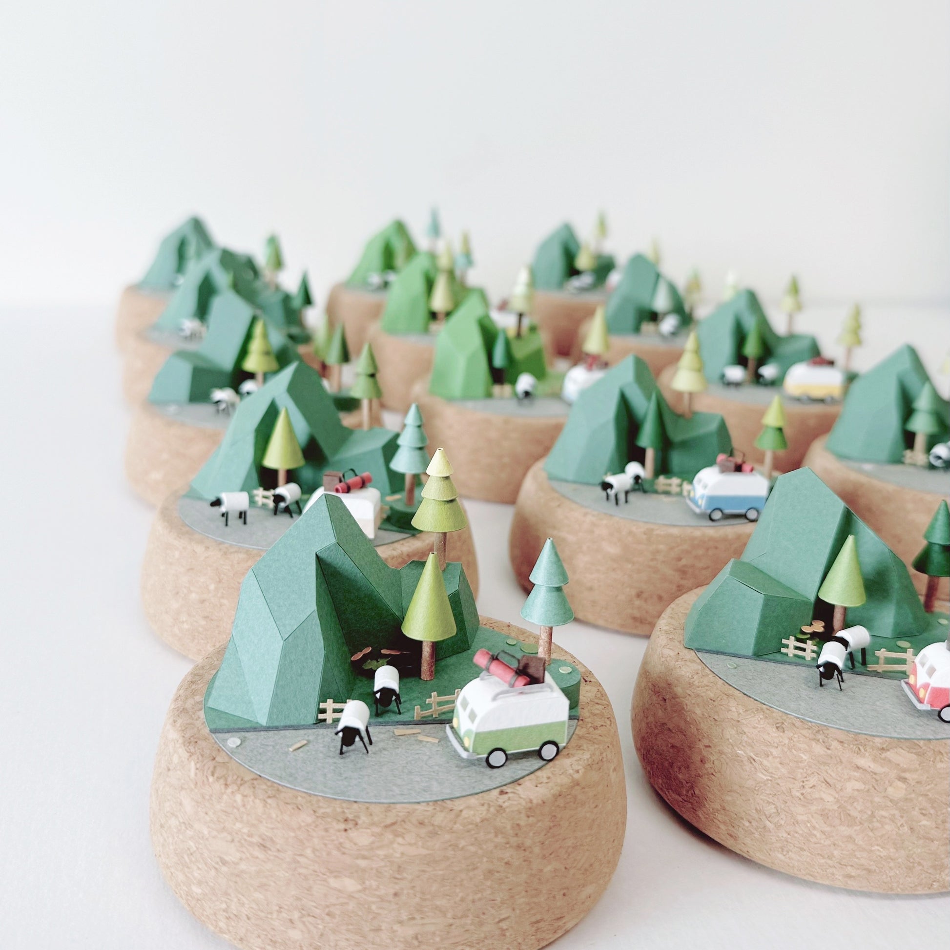 同品項作品組成以及配色會是相同的,像是左圖的露營地景都有深綠色的山脈以及台地、紅色的露營車、橘色的帳篷以及營火、深色步道,還有三棵松樹。不過元素的相對位置會有微調,像是點點苔蘚的位置也都不同。